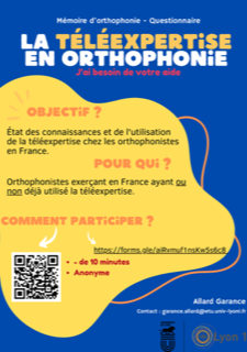 Dans le cadre de mon mémoire je réalise une enquête à destination des orthophonistes français afin de connaître leur connaissance et leur utilisation de la téléexpertise en orthophonie. L’objectif est d’identifier les défis auxquels les orthophonistes sont confrontés et de réfléchir aux moyens de faciliter l’adoption de cette pratique innovante.
