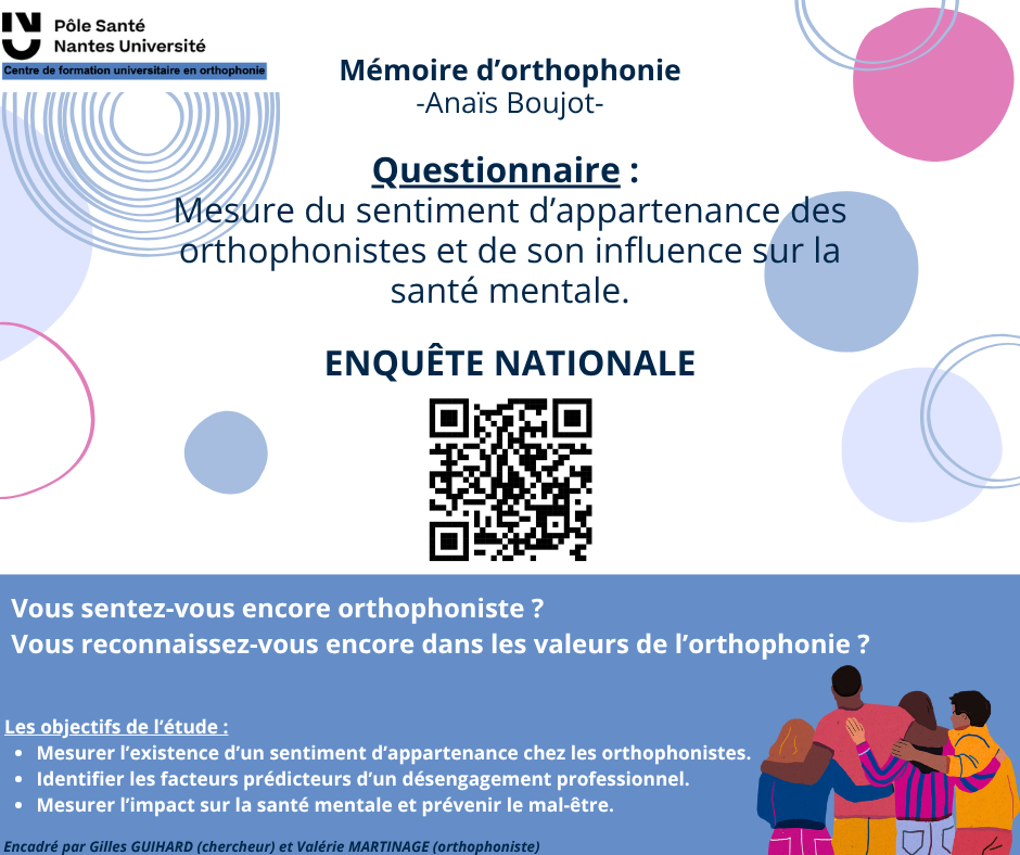 Je m’appelle Anaïs Boujot, étudiante en 5ᵉ année d’orthophonie au CFUO de Nantes. Dans le cadre de mon mémoire de recherche, je mène une étude sur le sentiment d’appartenance et son influence sur la santé mentale des orthophonistes exerçant en France métropolitaine et en Outre-mer.