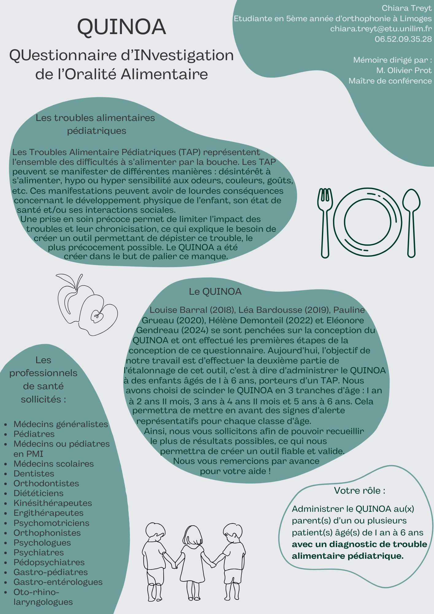 Je suis étudiante en 5ème année d’orthophonie à Limoges. Mon mémoire de fin d’étude porte sur la poursuite de la création d’un questionnaire de dépistage des troubles alimentaires pédiatriques : le QUINOA (QUestionnaire d’INvestigation de l’Oralité Alimentaire). Vous trouverez en pièce jointe une présentation de ce projet.