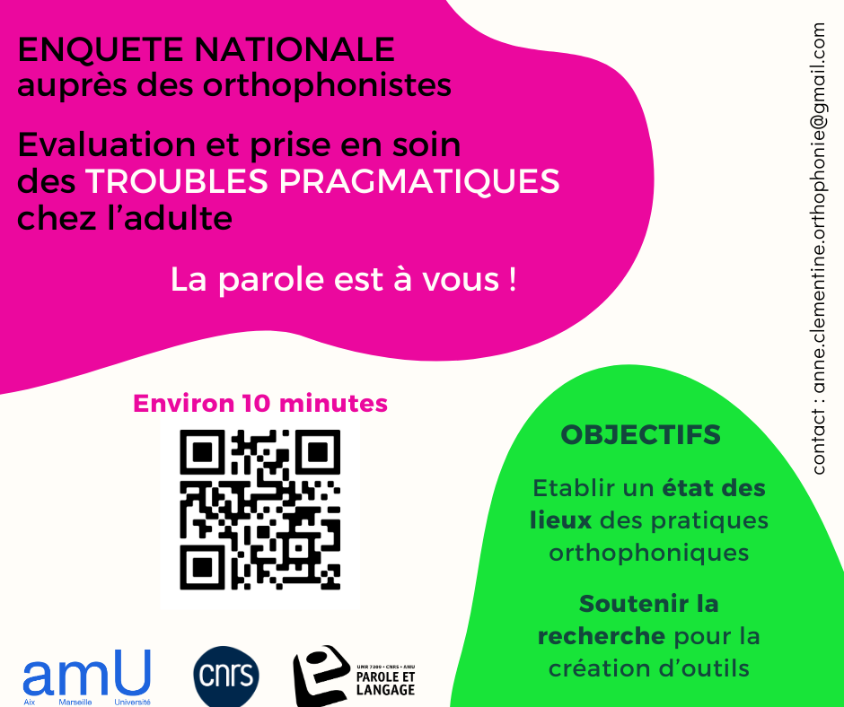 Dans le cadre de notre mémoire de fin d’études, nous menons une enquête auprès des orthophonistes de France afin de mieux comprendre les pratiques actuelles concernant l’évaluation et la prise en soin des troubles de la pragmatique chez l’adulte.